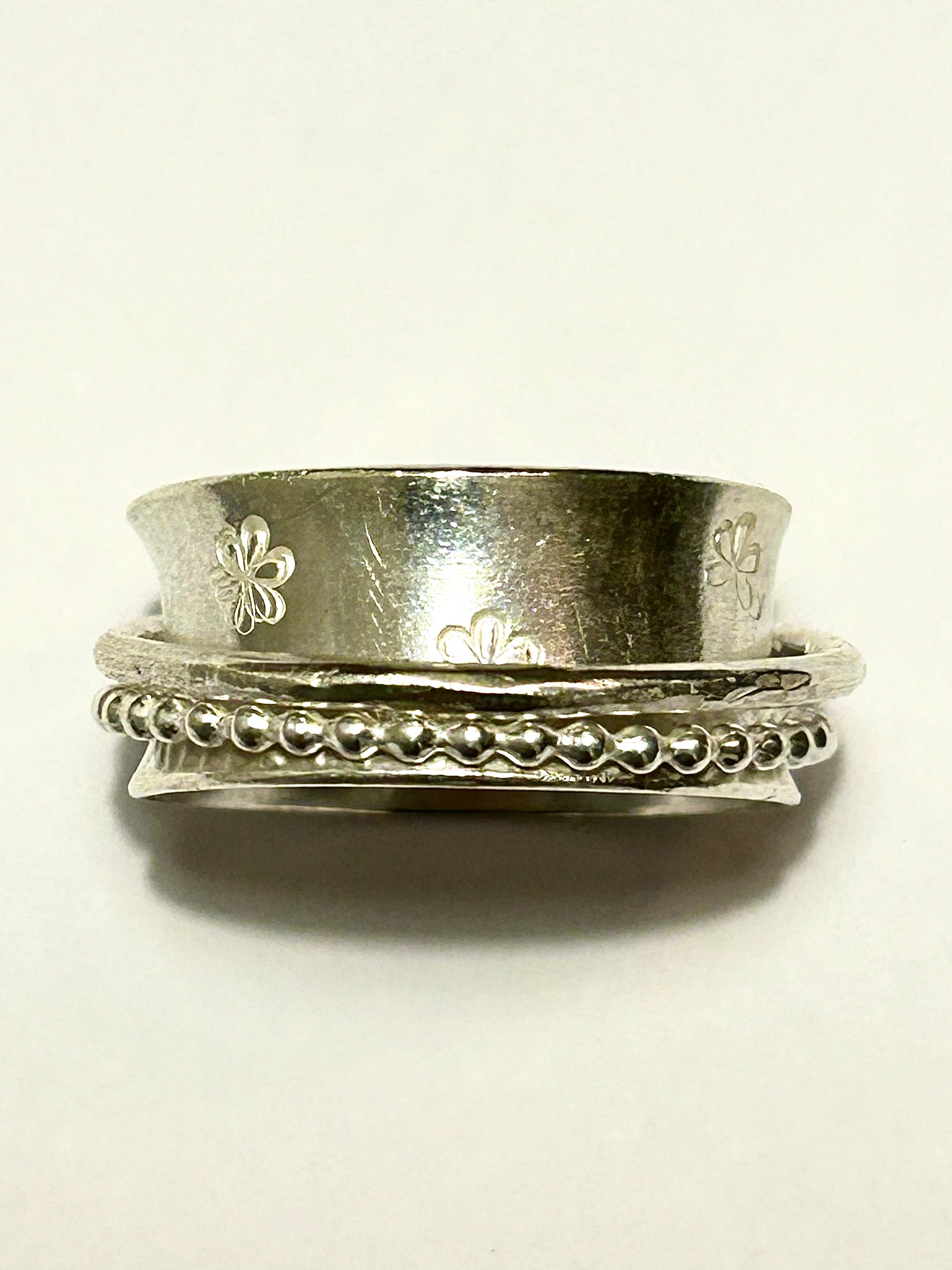 Handcrafted 925 sterling silver spinner ring with a delicate daisy pattern. It has two spins one plain and one beaded.