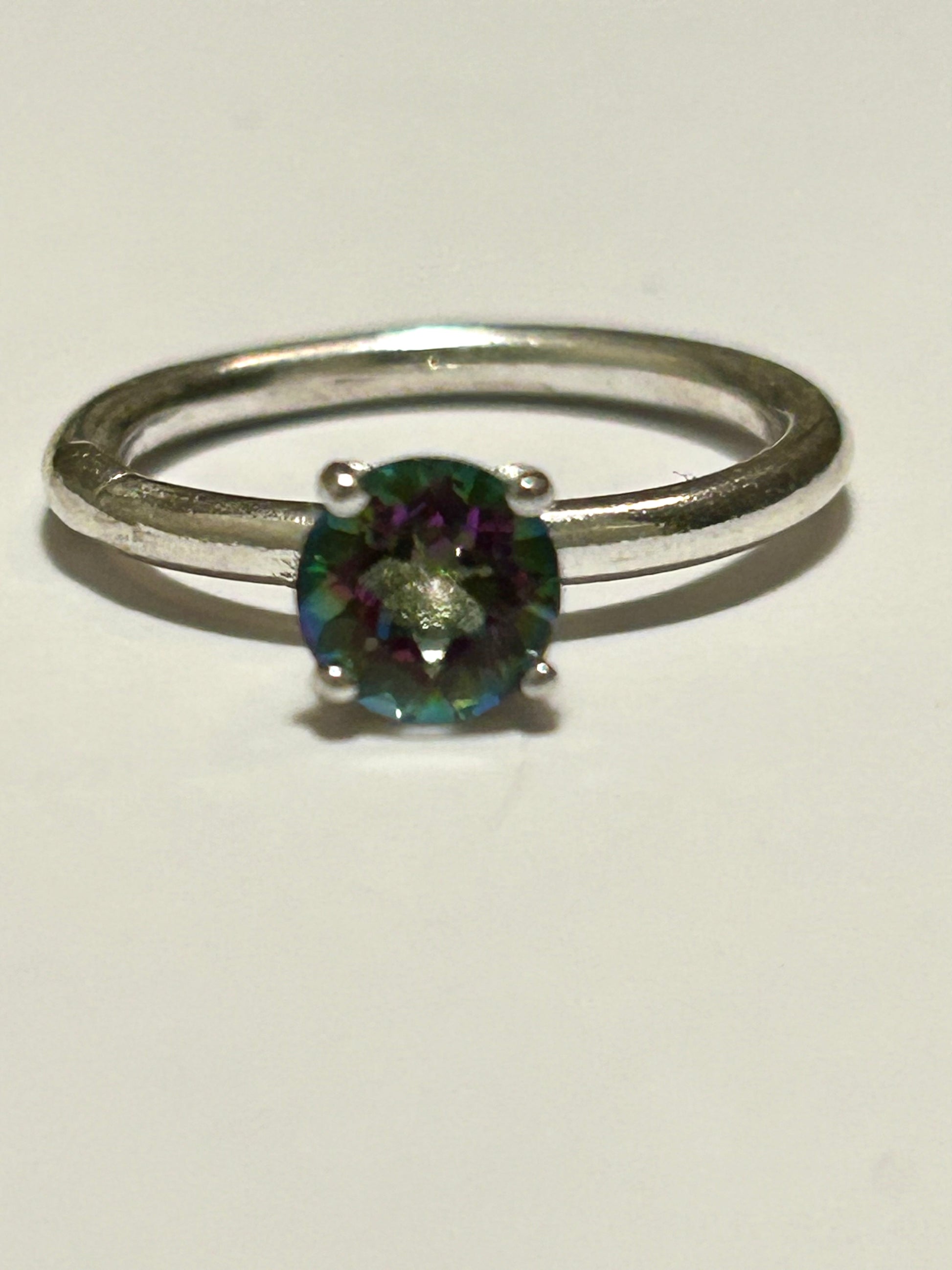 Handcrafted 925 Sterling silver 6mm round mystic fire topaz facted stone with a 4 pronged crown setting on a plain ring