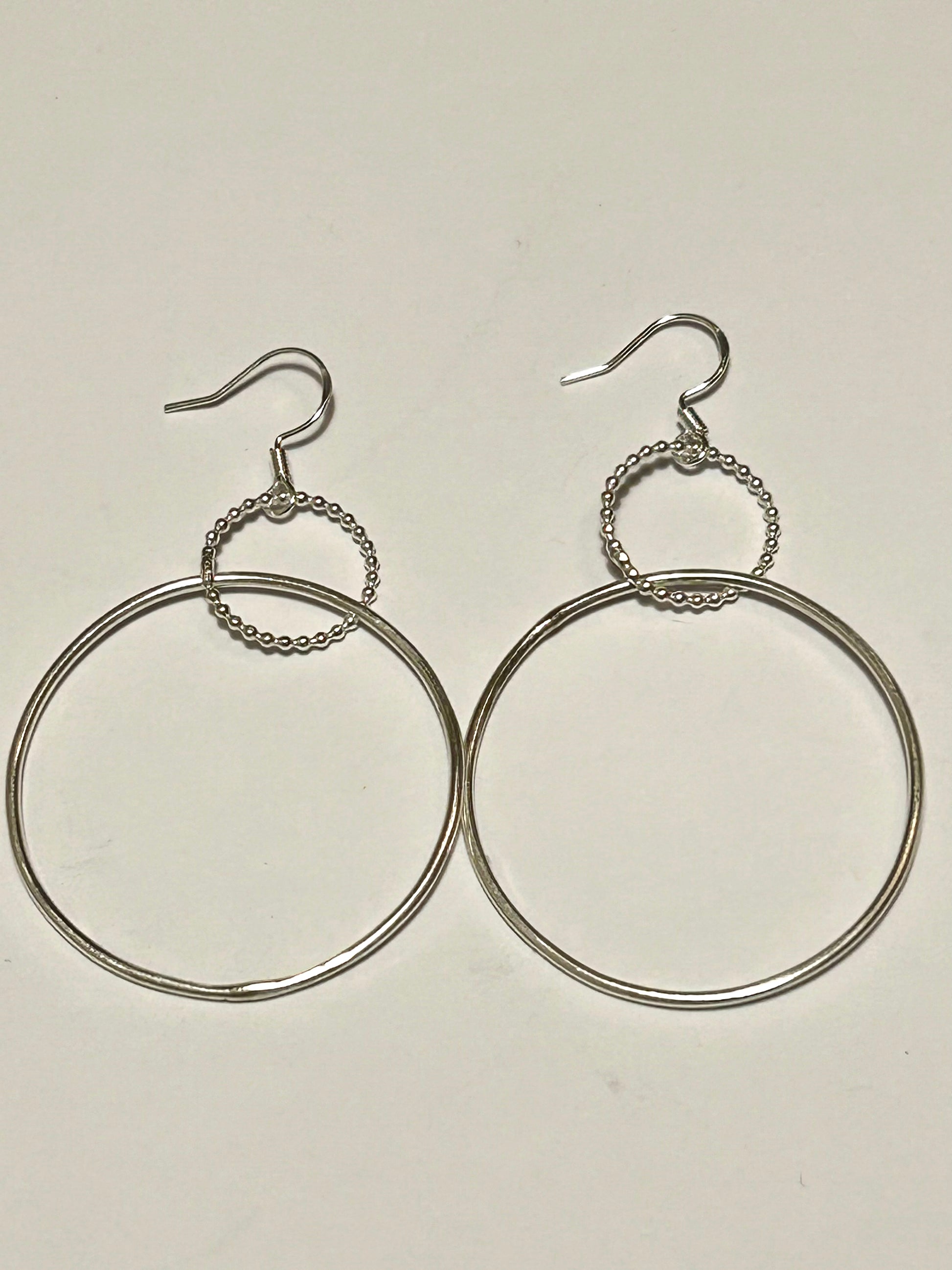 Handcrafted 925 Sterling silver Two hoop earrings with a 20mm diameter beaded hoop linked to a 43mm diamter plain hoop